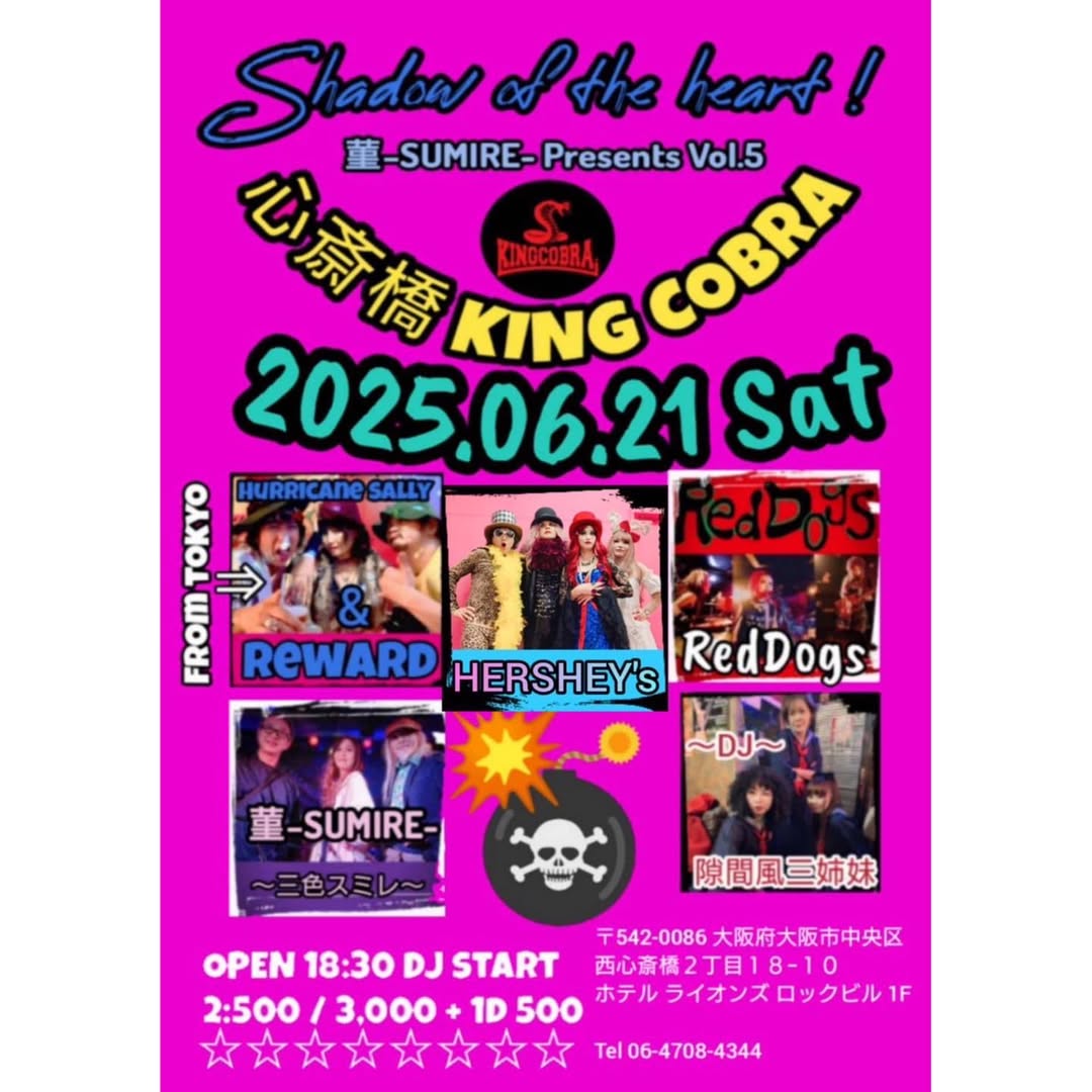~Shadow of the heart ! vol.5~ Jun 21, 2025 アメリカ村KING COBRA Source 2025.06.21(Sat) @心斎橋 KING COBRA ☆菫-SUMIRE- presents☆ ~Shadow of the heart ! vol.5~ □Hurricane Sally & Reward (東京) □HERSHEY’s □RedDogs □菫-SUMIRE- (三色スミレバージョン) DJ.隙間風三姉妹 18:30 Open DJ start ¥2,500 / ¥3,000 + 1d ¥500