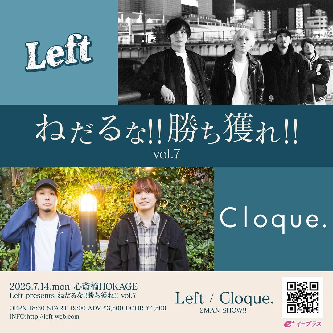 [ねだるな!!勝ち獲れ!!] Jul 14, 2025 HOKAGE Source . 7/14(Mon) Left PRESENTS [ねだるな!!勝ち獲れ!!] Left Cloque. 2MAN SHOW!! OPEN 18:30/START 19:00 ADV ¥3500/DOOR ¥4500 +1drink fee