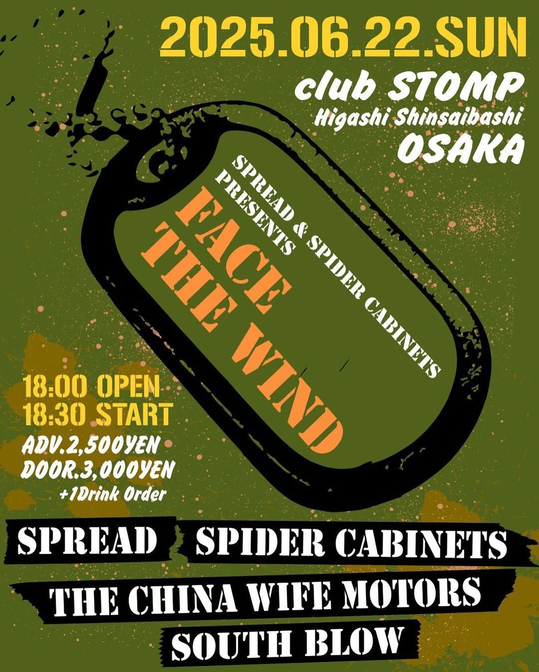 FACE THE WIND Jun 22, 2025 CLUB STOMP Source 6/22(日) 大阪東心斎橋clubSTOMP SPREAD&SPIDER CABINETS pre. “FACE THE WIND” SPREAD SPIDER CABINETS THE CHINA WIFE MOTORS SOUTH BLOW AD¥2500 DOOR¥3000 (+1drink order) OPEN18:00 START18:30