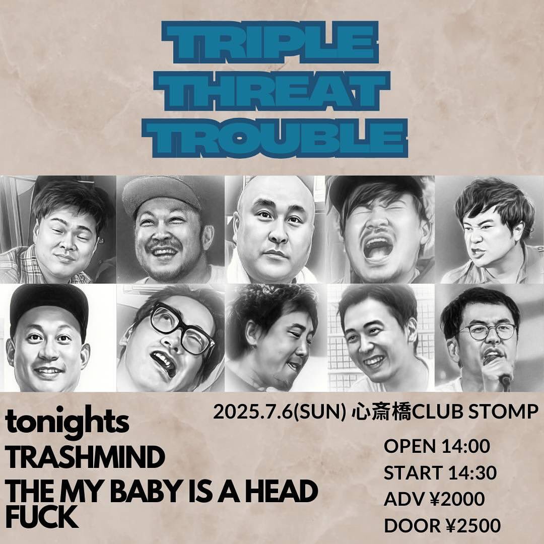 『Triple Threat Trouble』 Jul 6, 2025 CLUB STOMP Source the my baby is a head fuck 2025.7.6(日) 心斎橋clubSTOMP 『Triple Threat Trouble』 THE MY BABY IS A HEAD FUCK TRASHMIND tonights OPEN 14:00 START 14:30 ADV ¥2000 DOOR ¥2500 +1D