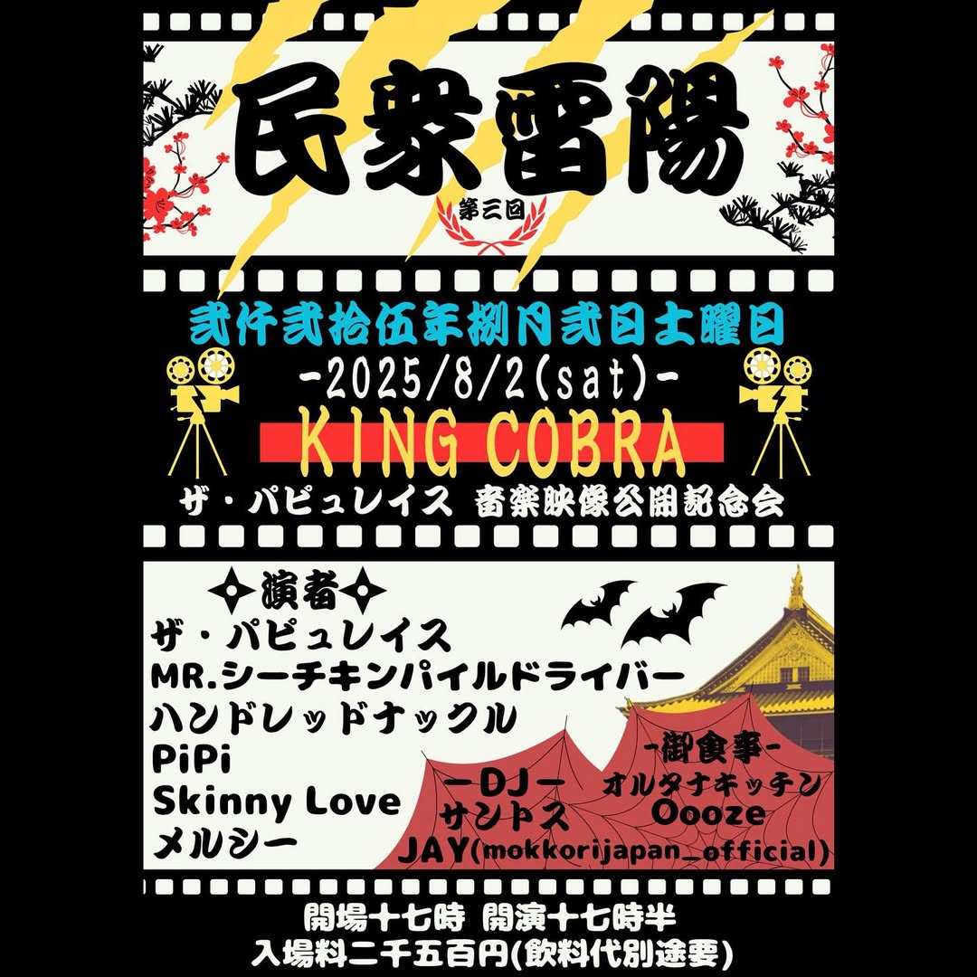 民衆雷陽 Aug 2, 2025 アメリカ村KING COBRA Source メルシー mr.シーチキンパイルドライバー pipi the populace 8月2日(土)KING COBRA 民衆雷陽 ザ・パピュレイス 音楽映像公開記念会 ザ・パピュレイス MR.シーチキンパイルドライバー ハンドレッドナックル PiPi Skinny Love メルシー DJ サントス JAY(mokkorijapan_official) 御食事 オルタナキッチンOooze 開場17時/開演17時半 入場料2500円(飲料代別途用)