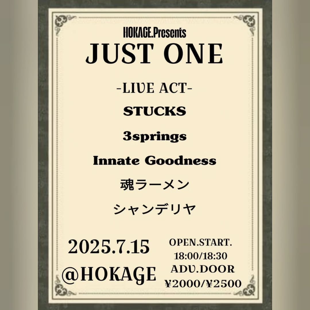 「JUST ONE」 Jul 15, 2025 HOKAGE Source stucks 3springs 🎉ライブ情報解禁🎉 2025年 7月15日 (火) 心斎橋火影 HOKAGE.Presents 「JUST ONE」 w/ STUCKS 3springs Innate Goodness 魂ラーメン シャンデリヤ 🕒OPEN/START »> 18:00/18:30 🎫取り置き/当日 »> ¥2,000/¥2,500 取り置きはこちらのアカウントか、 メンバーのDMにお願いします🙇♀️ めちゃくちゃアツいバンドと 最高にアツい火影🔥🔥 ブチアゲに行くぞ〜〜‼️