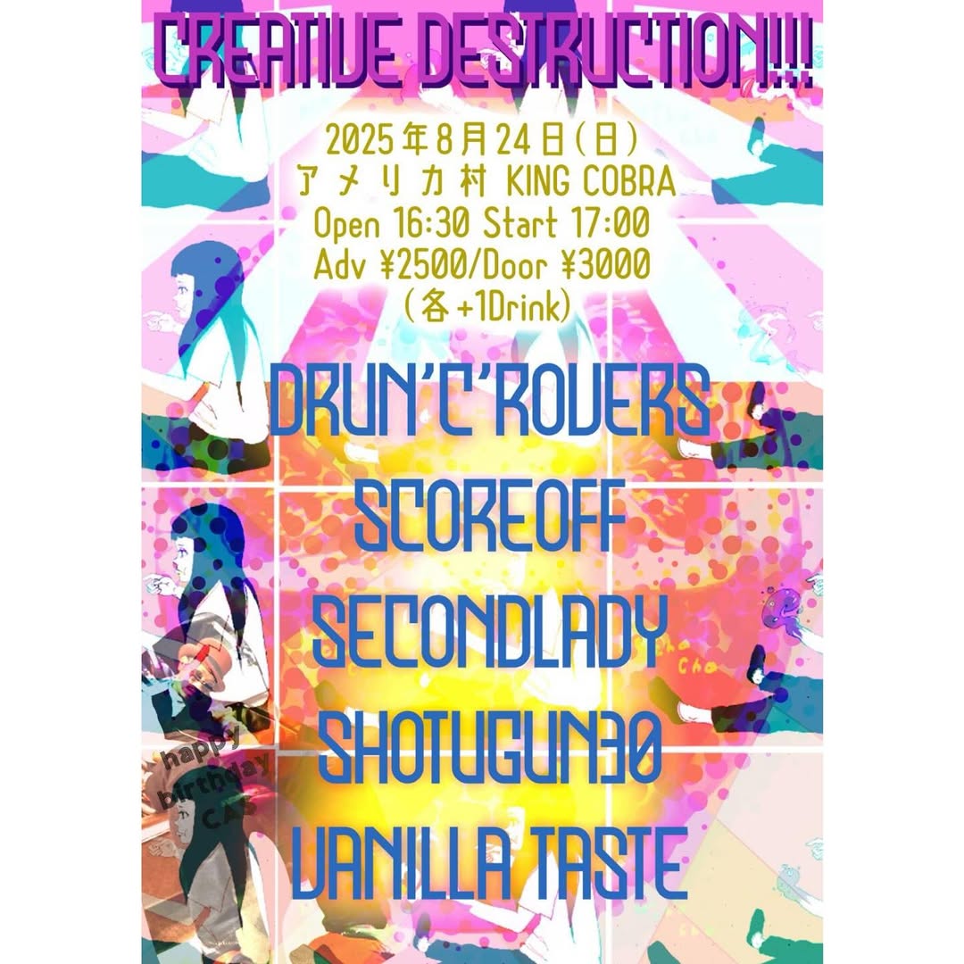8/24 CREATIVE DESTRUCTION!!! Aug 24, 2025 アメリカ村KING COBRA Source secondlady 8/24 CREATIVE DESTRUCTION!!! OPEN 16:30 START 17:00 ADV ¥2,500 DOOR ¥3,000 DRUN’C’ROVERS SCOREOFF SECONDLADY SHOTGUN30 VANILLA TASTE