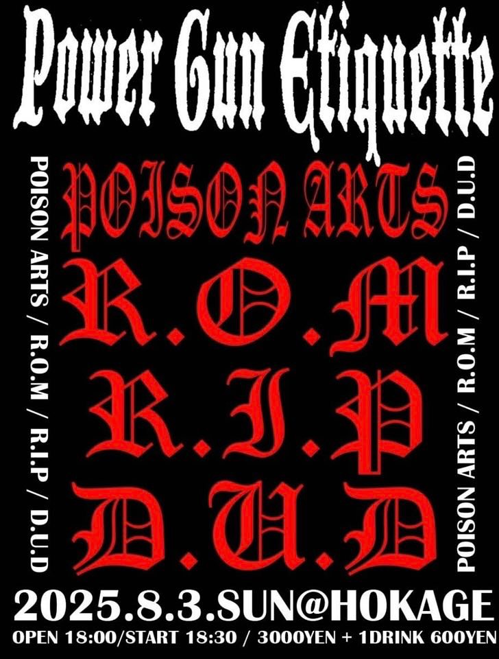 [Power Gun Etiquette] Aug 3, 2025 HOKAGE Source punk hardcore . THIS SUNDAY🔥 PUNK HARDCORE ROCKERS⚡️ 8/3(SUN)HOKAGE [Power Gun Etiquette] POISON ARTS(Tokyo) R.O.M R.I.P D.U.D OPEN 18:00/START 18:30 ¥3000+1 DRINK \600