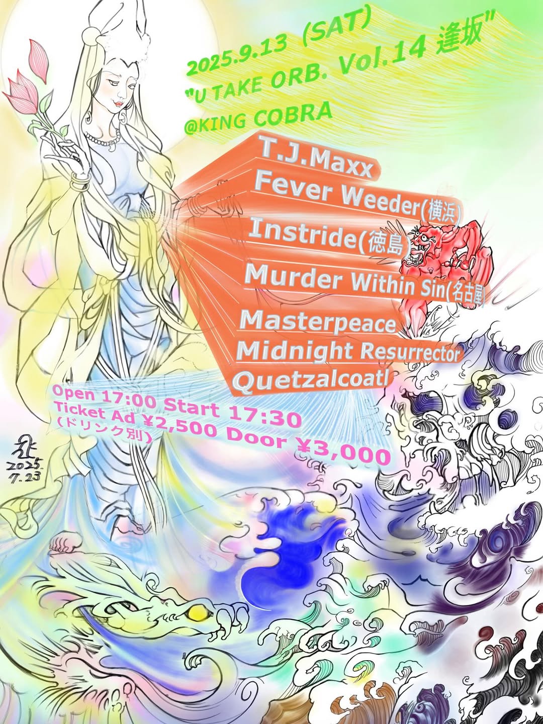 'U TAKE ORB. Vol.14 逢坂' Sep 13, 2025 アメリカ村KING COBRA Source 2025.9.13(SAT) “U TAKE ORB. Vol.14 逢坂” @KING COBRA T.J.Maxx Fever Weeder(横浜) Instride(徳島) Murder Within Sin(名古屋) Masterpeace Midnight Resurrector Quetzalcoatl Open 17:00 Start 17:30 Ticket Ad ¥2,500 Door ¥3,000 (ドリンク別) +1D¥500