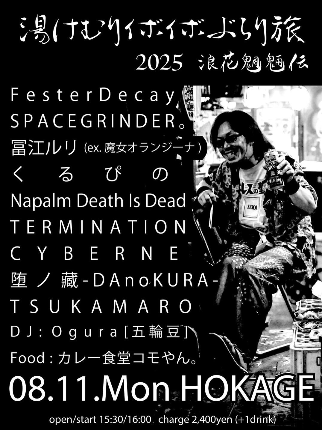 [湯けむりイボイボぶらり旅] Aug 11, 2025 HOKAGE Source hardcore punk cyberne . TONIGHT‼️ HARDCORE PUNK NOISE ALL MIX SHOW💥 8/11(Mon)HOKAGE [湯けむりイボイボぶらり旅] Fester Decay SPACEGRINDER。 富江ルリ(ex.魔女オランジーナ) くるぴの Napalm Death Is Dead TERMINATION CYBERNE 堕ノ藏 TSUKAMARO DJ: Ogura[五輪豆] Food: カレー食堂こもやん。 OPEN 15:30/START 16:00 ¥2400+1D