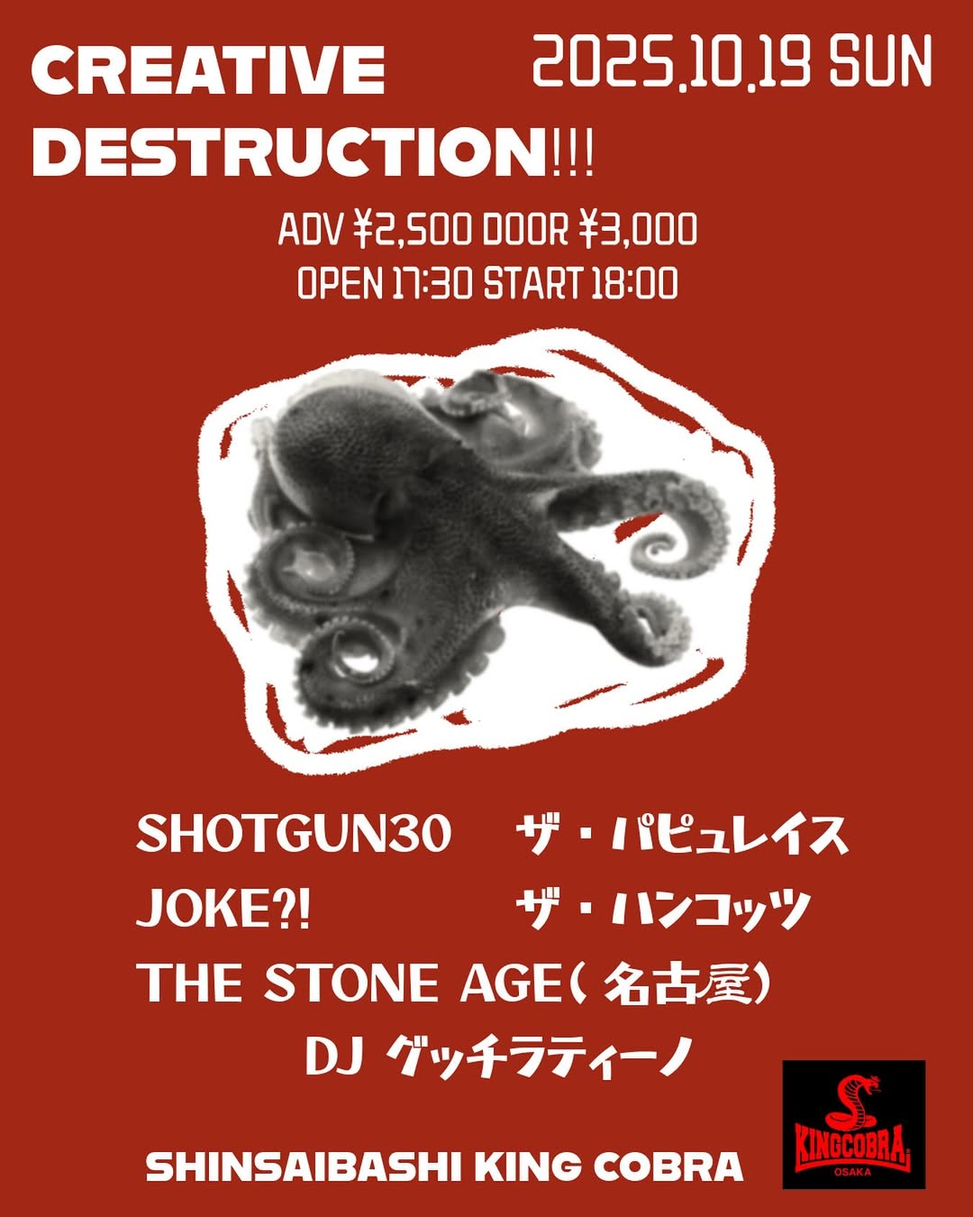 10/19(日)『CREATIVE DESTRUCTION!!!』 Oct 19, 2025 アメリカ村KING COBRA Source the populace 10/19(日)『CREATIVE DESTRUCTION!!!』 ADV ¥2,500 DOOR ¥3,000 OPEN 17:30 START 18:00 THE STONE AGE(名古屋) SHOTGUN30 JOKE?! ザ・パピュレイス ザ・ハンコッツ DJ グッチラティーノ