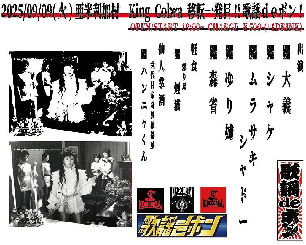 歌謡deポン!! Sep 9, 2025 アメリカ村KING COBRA Source 9月9日(火) 歌謡deポン!! @KINGCOBRA CHARGE ¥500 OPEN/START 19:00 DJ: ■大義 ■シャケ ■ムラサキシャドー ■ゆり姉 ■森省 FOOD: ■燻り屋 煙猫 TEQUILA: ■弐代目帝奇異羅暴威 ハンニャくん