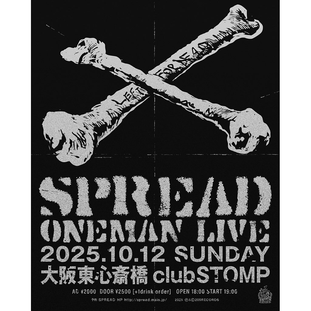 'SPREAD ONEMAN LIVE!!' Oct 12, 2025 CLUB STOMP Source 10/12(日)大阪東心斎橋clubSTOMP “SPREAD ONEMAN LIVE!!” AD¥2000 DOOR¥2500 (+1drink order) OPEN18:00 START19:00 予約 SPREAD HP http://spread.main.jp/ 2025 P&C 205RECORDS