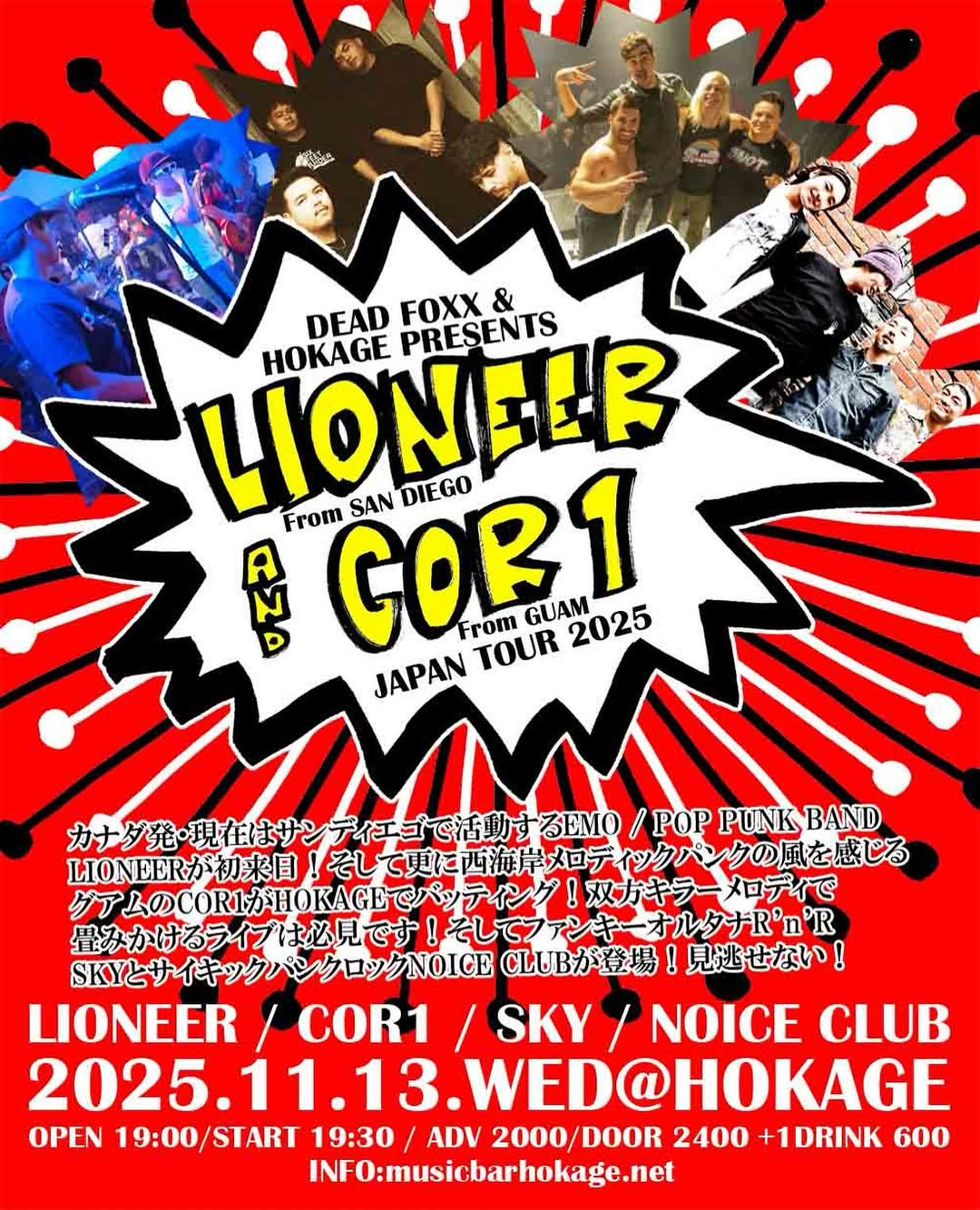 カナダ発・現在はサンディエゴで活動するEMO / POP PUNK BAND、 @lioneermusic が初来日!そして更に西海岸メロディックパンクの風を感じるグアムの @cor1.gu がHOKAGEでバッティング!双方キラーメロディで畳みかけるライブは必見です!そしてファンキーオルタナR’n’R SKY とサイキックパンクロックNOICE CLUBが登場!見逃せない!