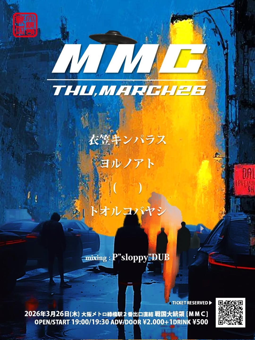 'MMC' Mar 26, 2026 Sengoku Daitouryo Source 2026年3月26日(木) 緑橋 戦国大統領 “MMC” OPEN/START 19:00/19:30 ADV/DOOR ¥2.000+1DRINK ¥500 衣笠キンパラス ヨルノアト ( ) トオルコバヤシ (BGM&DUB Live) P”sloppy”DUB #戦国大統領 #MMC