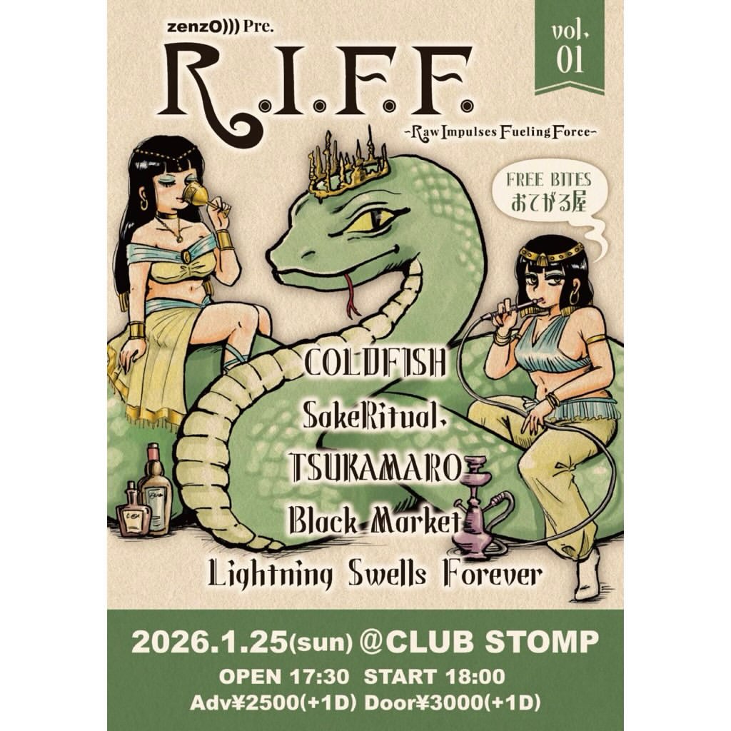 「Raw Impulses Fueling Force」 Jan 25, 2026 CLUB STOMP Source coldfish lightning swells forever zenzO))) Pre. R.I.F.F.vol.01 「Raw Impulses Fueling Force」 CLUB STOMP 2026.1.25(sun) 17:30 OPEN 18:00 START Adv¥2500(+1D)Door¥3000(+1D) SakeRitual. COLDFISH Black Market TSUKAMARO Lightning Swells Forever -FREE BITES- おてがる屋