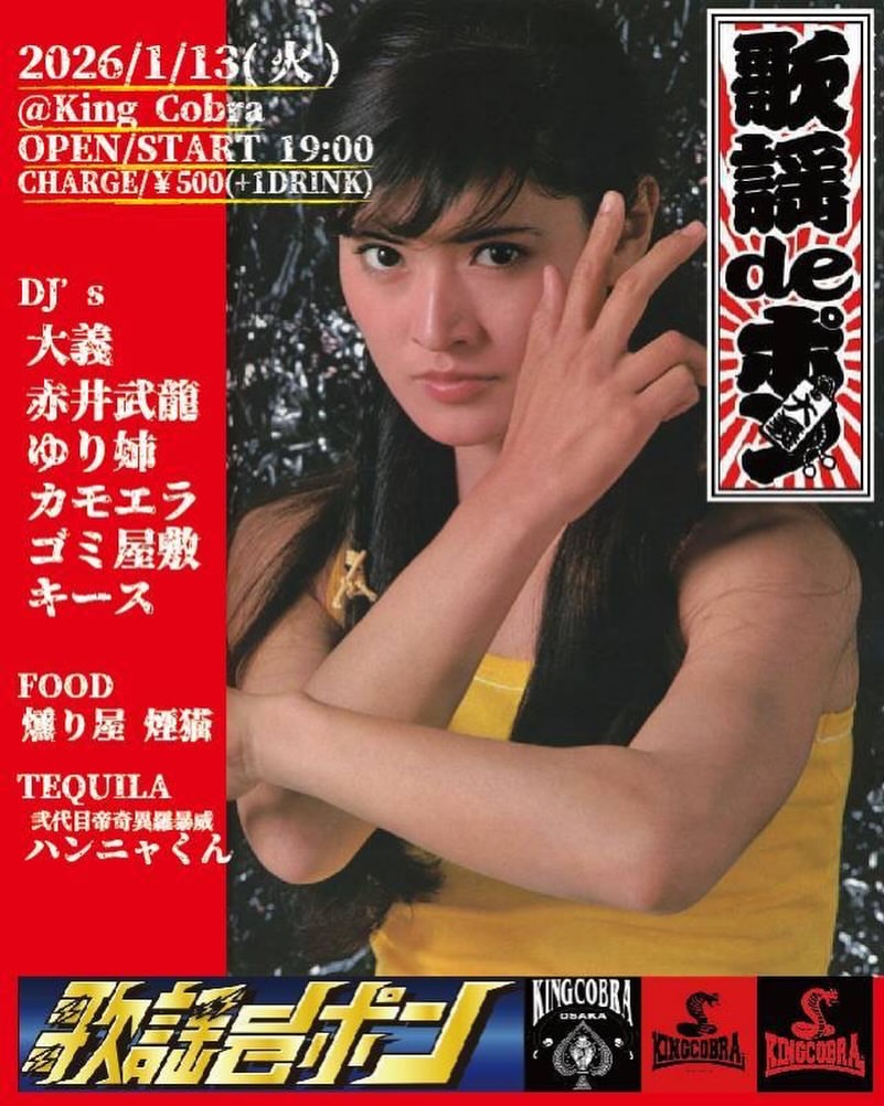 歌謡deポン!! Jan 13, 2026 アメリカ村KING COBRA Source 1月13日(火) 歌謡deポン!! @KINGCOBRA CHARGE ¥500 OPEN/START 19:00 DJ: ■大義 ■赤井武龍 ■ゆり姉 ■カモエラ ■ゴミ屋敷 ■キース FOOD: ■燻り屋 煙猫 TEQUILA: ■弐代目帝奇異羅暴威 ハンニャくん