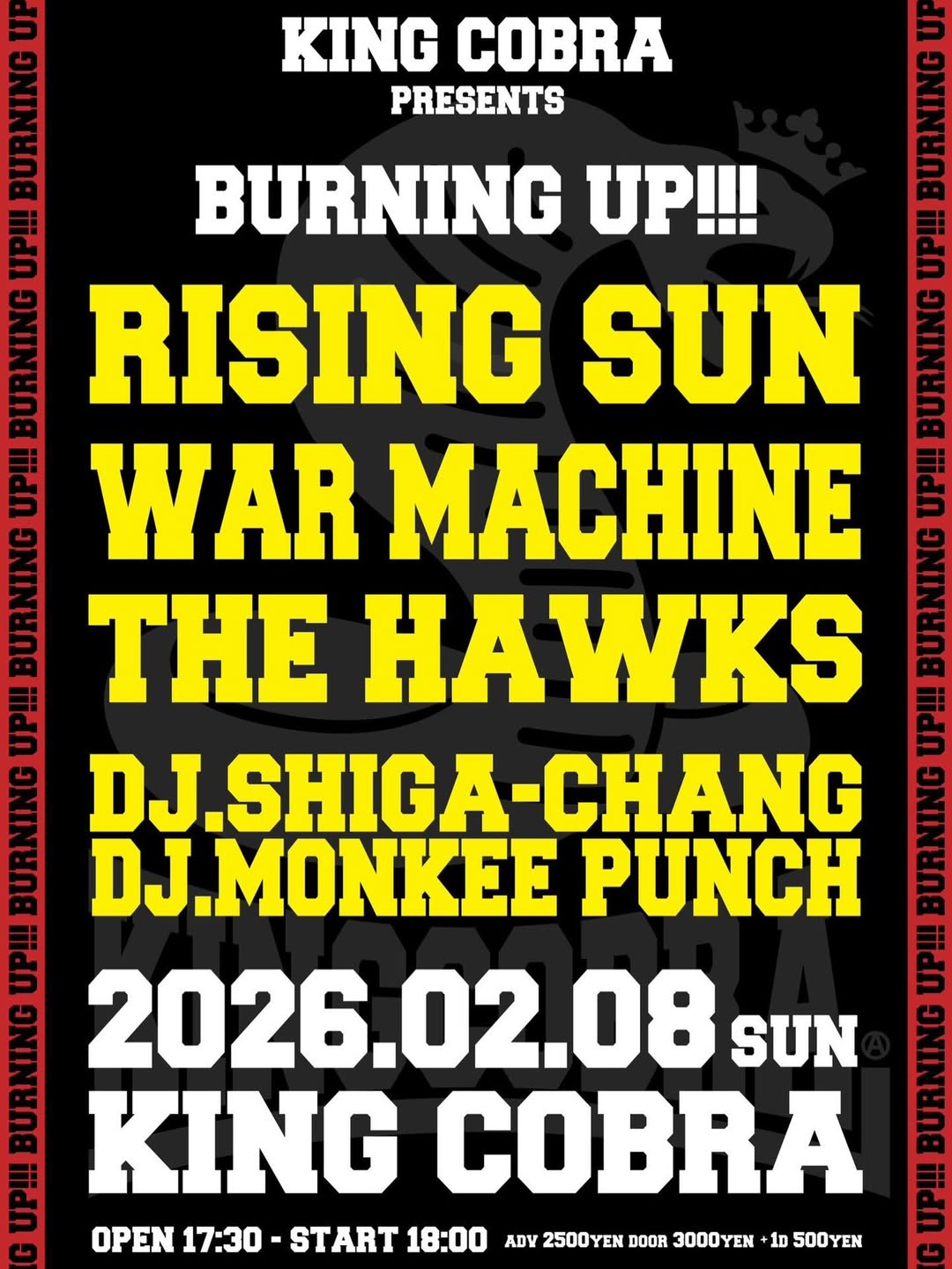 2026.2.8(SUN)KING COBRA Feb 8, 2026 アメリカ村KING COBRA Source 2026.2.8(SUN)KING COBRA “BURNING UP!!!”[KING COBRA PRESENTS] RISING SUN WAR MACHINE THE HAWKS DJ: SHIGA-CHANG MONKEE PUNCH Open17:30Start18:00 ADV¥2500 DOOR¥3000+1D ¥500