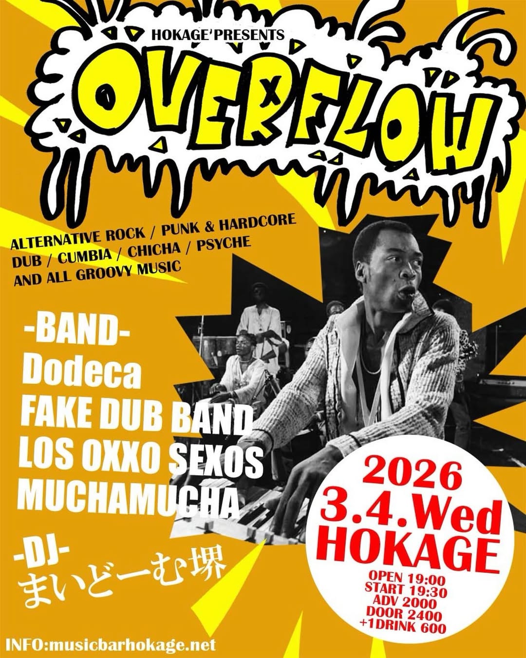 [OVERFLOW!] Mar 4, 2026 HOKAGE Source fake dub band . 3/4(Wed) HOKAGE [OVERFLOW!] Dodeca FAKE DUB BAND MUCHAMUCHA LOS OXXO SEXOS DJ まいどーむ堺 OPEN 19:00/START 19:30 ADV ¥2000/DOOR ¥2400 +1drink ¥600 . . #MusicBarHOKAGE #HOKAGE #ホカゲ #火影 #livemusicvenue