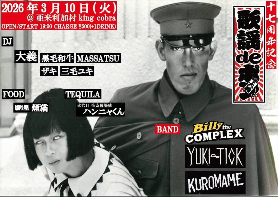 歌謡deポン!! 十七周年 Mar 10, 2026 アメリカ村KING COBRA Source 3月10日(火) 歌謡deポン!! 十七周年 @KINGCOBRA CHARGE ¥500 OPEN/START 19:00 DJ: ■大義 ■黒毛和牛 ■MASSATSU ■ザキ ■三毛ユキ LIVE: ■Billy the complex ■YUKI-TICK ■KUROMAME FOOD: ■燻り屋 煙猫 TEQUILA: ■弐代目帝奇異羅暴威 ハンニャくん