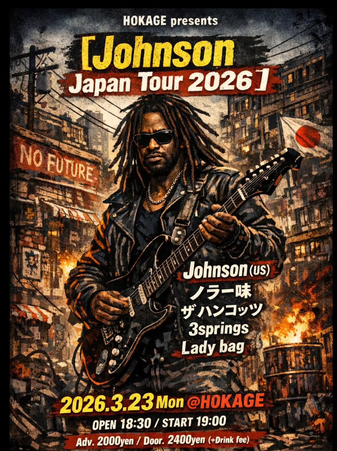 [Johnson Japan Tour 2026 ] Mar 23, 2026 HOKAGE Source ノラ一味 3springs . 🔥NEW SHOW🔥 2026.3.23.Mon HOKAGE presents [Johnson Japan Tour 2026 ] Johnson(US) ノラ一味 ザ ハンコッツ 3springs Lady bag OPEN: 18:30 START: 19:00 Adv. 2000yen Door.2400yen (+Drink fee) . . . . . #MusicBarHOKAGE #HOKAGE #ホカゲ #火影 #livemusicvenue