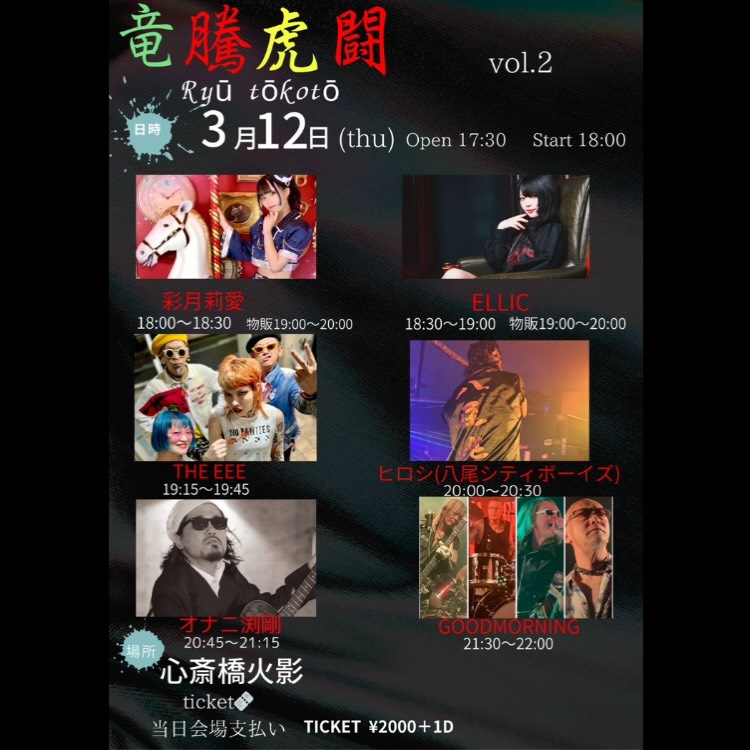 [Ryu tokoto] Mar 12, 2026 HOKAGE Source punk hardcore the eee good morning . TONIGHT HOKAGE PUNK / HARDCORE とアイドルとフォーク弾き語りがぶつかるカオスナイト⚡️ 3/12 (Thu) HOKAGE [Ryu tokoto] GOOD MORNING オナニ渕剛 ヒロシ(八尾シティボーイズ) THE EEE ELLIC 彩月莉愛 OPEN 17:30/START 18:00 DOOR ¥2000+1drink ¥600 . . #MusicBarHOKAGE #HOKAGE #ホカゲ #火影 #livemusicvenue