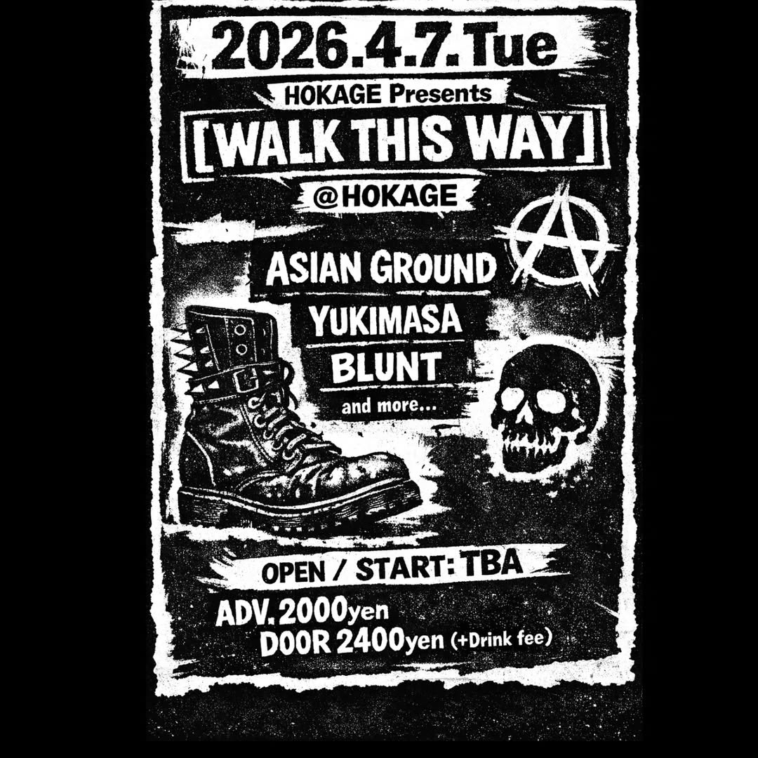 [WALK THIS WAY] Apr 7, 2026 HOKAGE Source . 🔥NEW SHOW🔥 2026.4.7.Tue HOKAGE Presents [WALK THIS WAY] ASIAN GROUND YUKIMASA BLUNT and more…. OPEN START TBA ADV.2000yen DOOR.2400yen(+Drink fee) . . . . #MusicBarHOKAGE #HOKAGE #ホカゲ #火影 #livemusicvenue