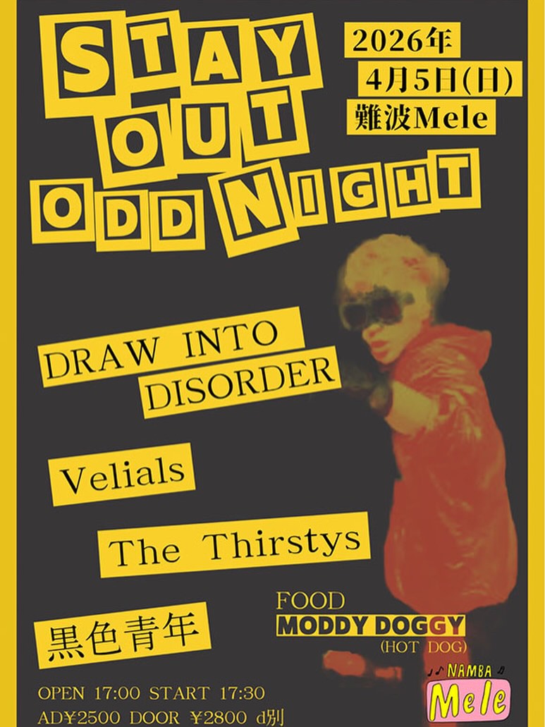 「STAY OUT ODD NIGHT」 Apr 5, 2026 NAMBA Mele Source nambamele もう少しで新生活🌸 春突入のメレはゴリゴリのサウンドでどうぞ! 2026年4月5日(日) @難波Mele 「STAY OUT ODD NIGHT」 OPEN 17:00 START 17:30 AD¥2500 DOOR ¥2800 d別 DRAW INTO DISORDER Velials The Thirstys 黒色青年 FOOD: MODDY DOGGY(ホットドッグ) #難波Mele #nambamele #ライブハウス #Livehouse
