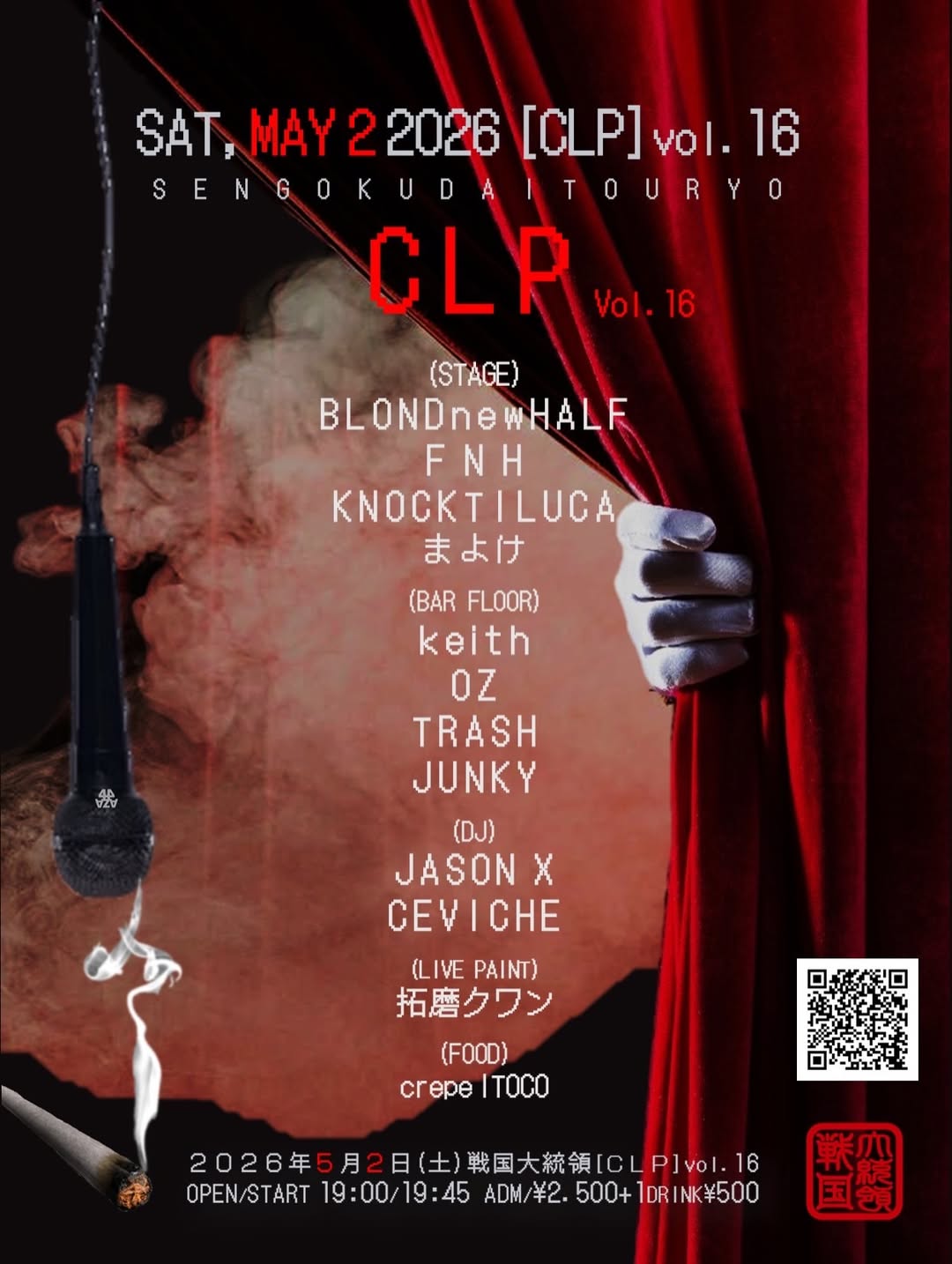 緑橋 戦国大統領 「CLP vol.16」 May 2, 2026 Sengoku Daitouryo Source blondnewhalf clp 2026年5月2日(土) 緑橋 戦国大統領 「CLP vol.16」 OPEN/START 19:00/19:45 ADM/¥2.500+1DRINK¥500 [STAGE] BLONDnewHALF FNH KNOCKTILUCA まよけ [BarFloor] keith OZ TRASH JUNKY [LivePaint] 拓磨クワン [DJ] JASON X CEVICHE [Food] crepe ITOCO #戦国大統領 #CLP