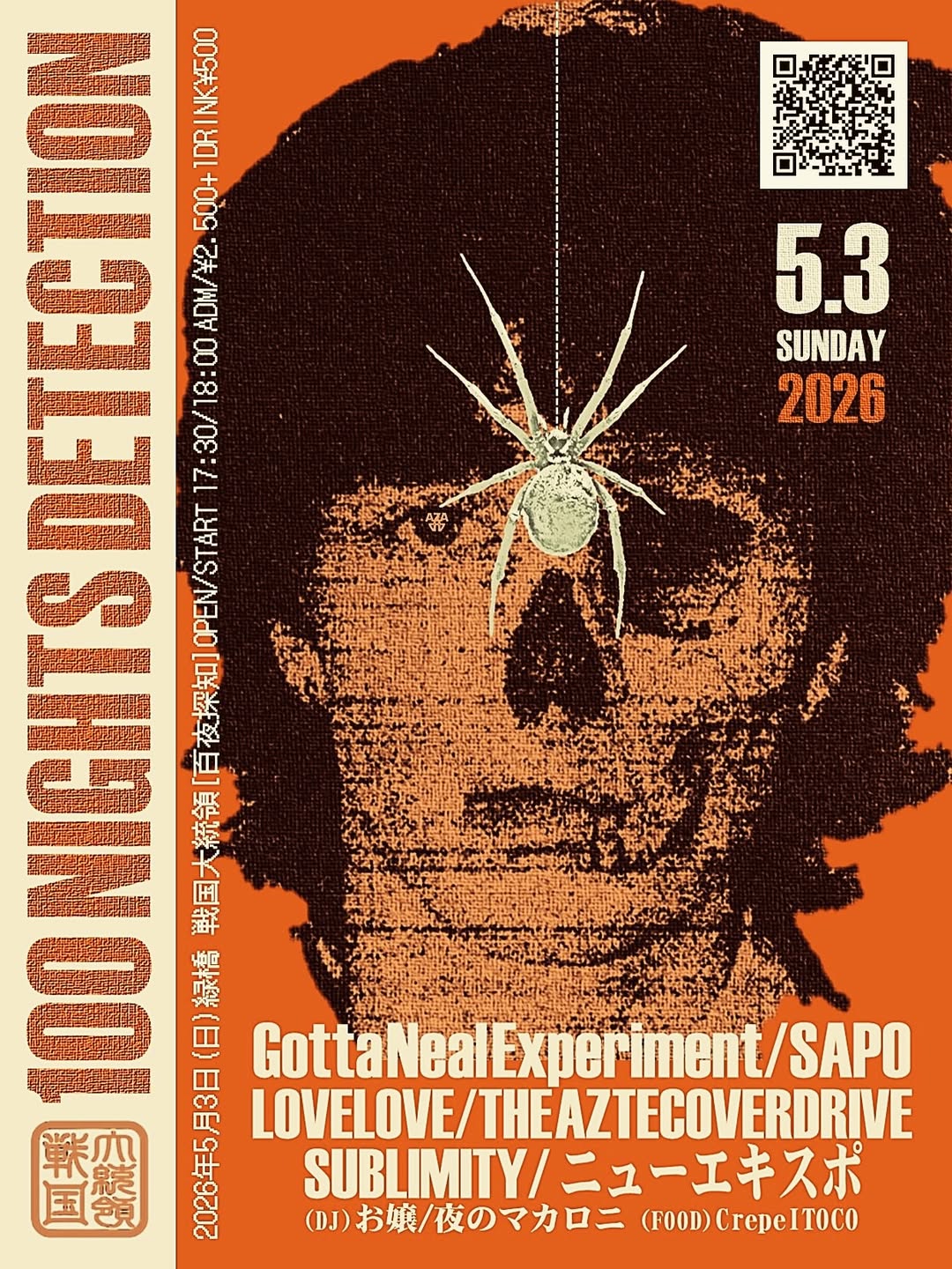 緑橋 戦国大統領 '百夜探知' May 3, 2026 Sengoku Daitouryo Source 百夜探知 2026年5月3日(日) 緑橋 戦国大統領 “百夜探知” OPEN/START 17:30/18:00 ADM/¥2.500+1DRINK¥500 (STAGE) Gotta Neal Experiment SUBLIMITY LOVELOVE SAPO ニューエキスポ THE AZTECOVERDRIVE (DJ) お嬢 夜のマカロニ (FOOD) crepe ITOCO #戦国大統領 #百夜探知