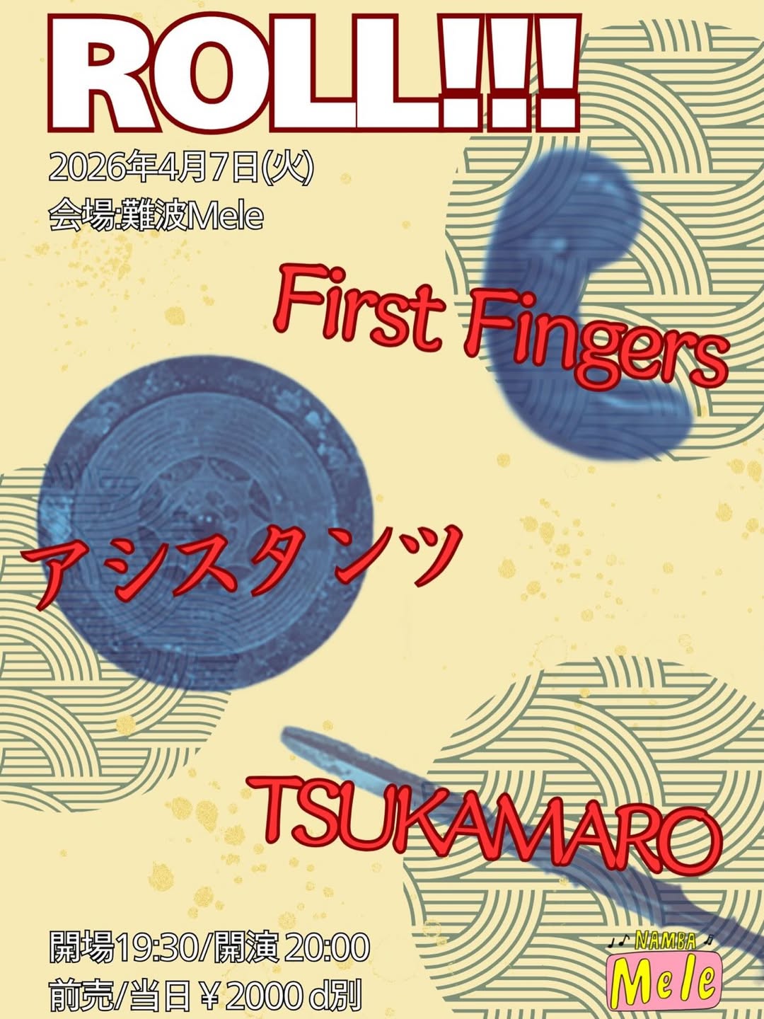 「ROLL!!!」 Apr 7, 2026 NAMBA Mele Source nambamele 平日!バチっとやっていこう!! オープン遅めです! 4月7日(火) 「ROLL!!!」 OPEN 19:30 START 20:00 AD/DOOR ¥2000 d別 アシスタンツ TSUKAMARO First Fingers #難波Mele #nambamele #ライブハウス #livehouse