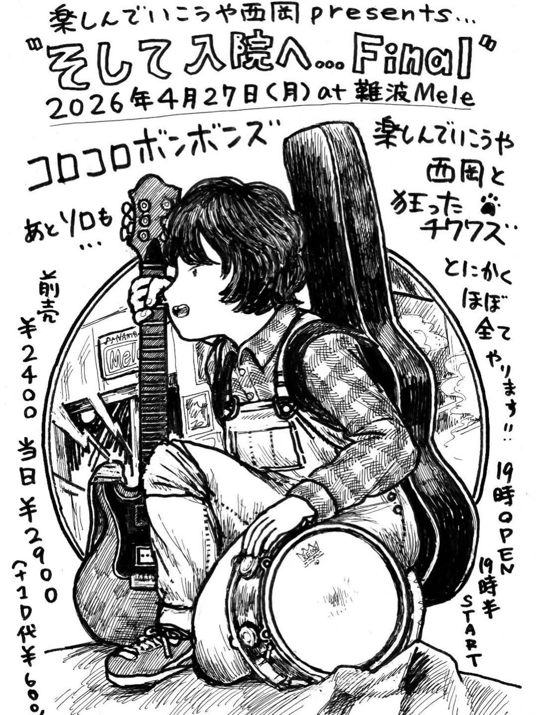 'そして入院へ... Final' Apr 27, 2026 NAMBA Mele Source colocolobomboms コロコロボンボンズや狂ったチワワズの西岡氏が、手術による入院・活休直前ファイナル公演の開催が決定! 西岡氏のソロもあります! ほぼ全てを出し尽くして入院へと臨みますのでぜひお越しください🏥 4月27日(月) 楽しんでいこうや西岡 presents… “そして入院へ… Final” OPEN 19:00 START 19:30 AD¥2400 DOOR ¥2900 d別 コロコロボンボンズ 楽しんでいこうや西岡と狂ったチワワズ